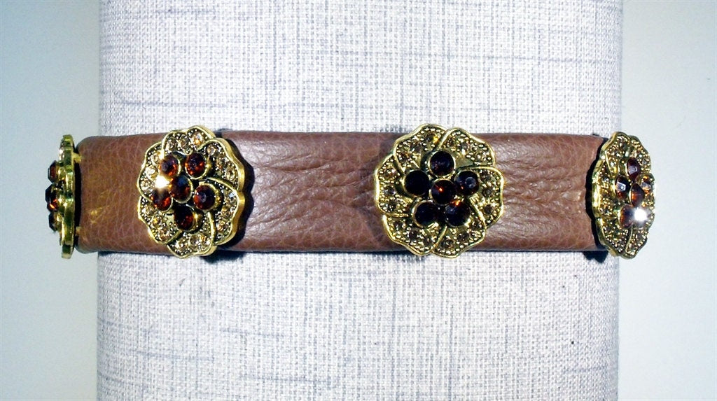 Dark amber colored jewels on a gold floral setting on brown leather.
