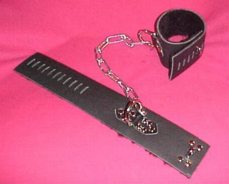 Heavy leather hasp style ankle cuffs with heavy 12" chain. Keeps them in their place!