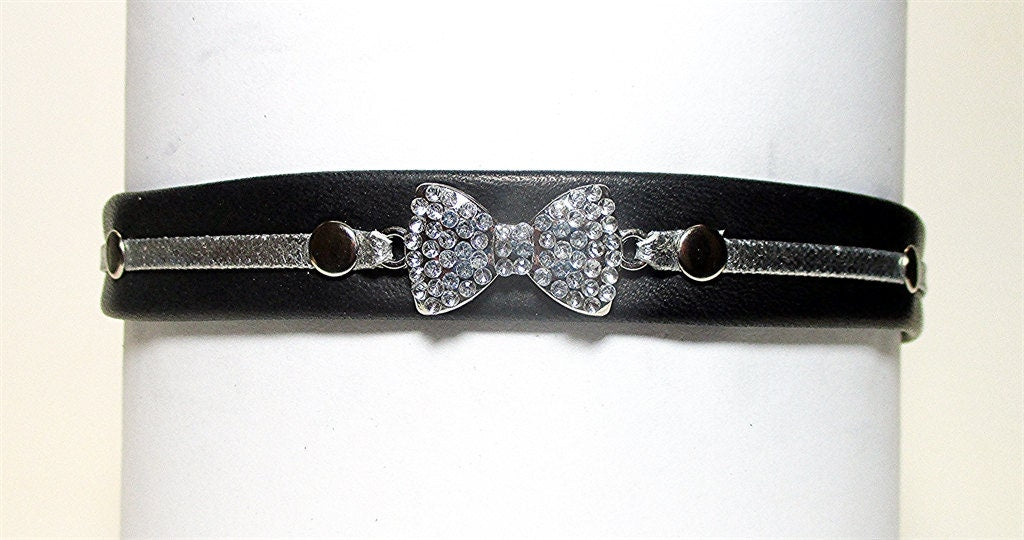 Formal or just for fun, clear crystals on a silver bow tie setting with a metallic silver lace highlight on premium black naked cowhide. A beautiful choker to the vanilla world.