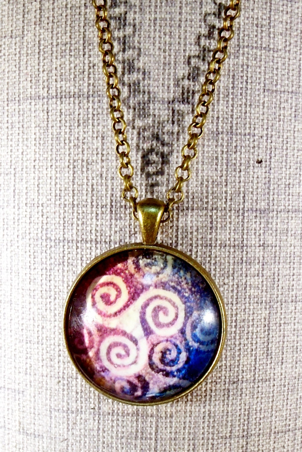 Celestial triskelion design with red and blues background on a 30mm round pendant necklace. Antique brass tone setting and chain.