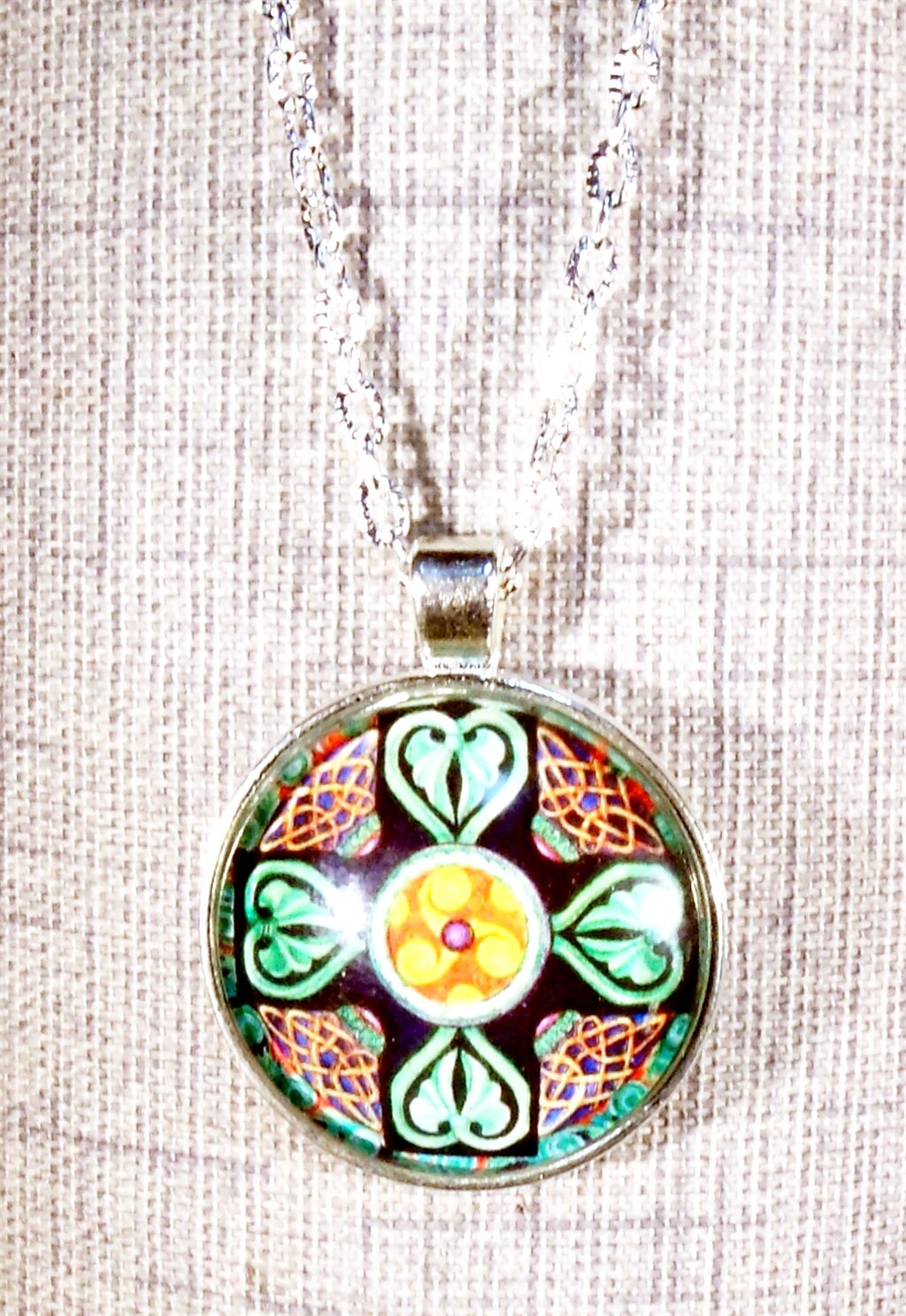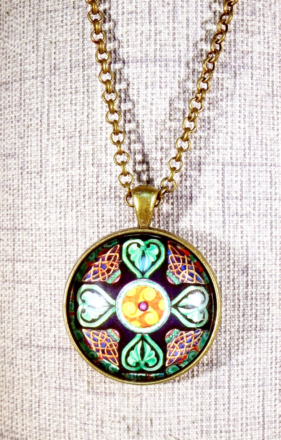 Celtic style hearts and knots around a triskelion design on a 30mm round pendant necklace. Antique brass or silver tone setting and chain.