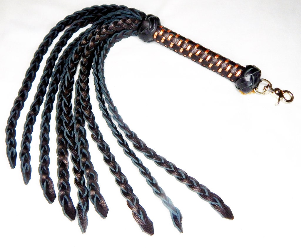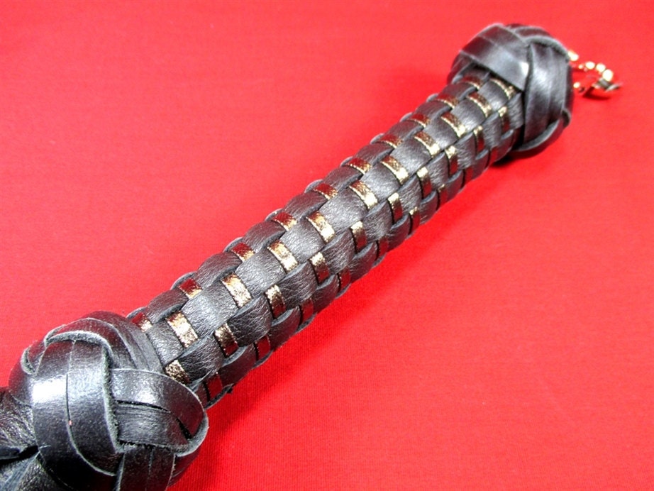 Soft heavy weight black leather flat braided 9-tail flogger / cat. Falls are hand crafted from laminated soft tumbled cowhide. Handle is braided with whisky kangaroo lace. Overall 29" with 8" handle and nine 21" (cut length) flat braided falls. Weighted and balanced for precise control.