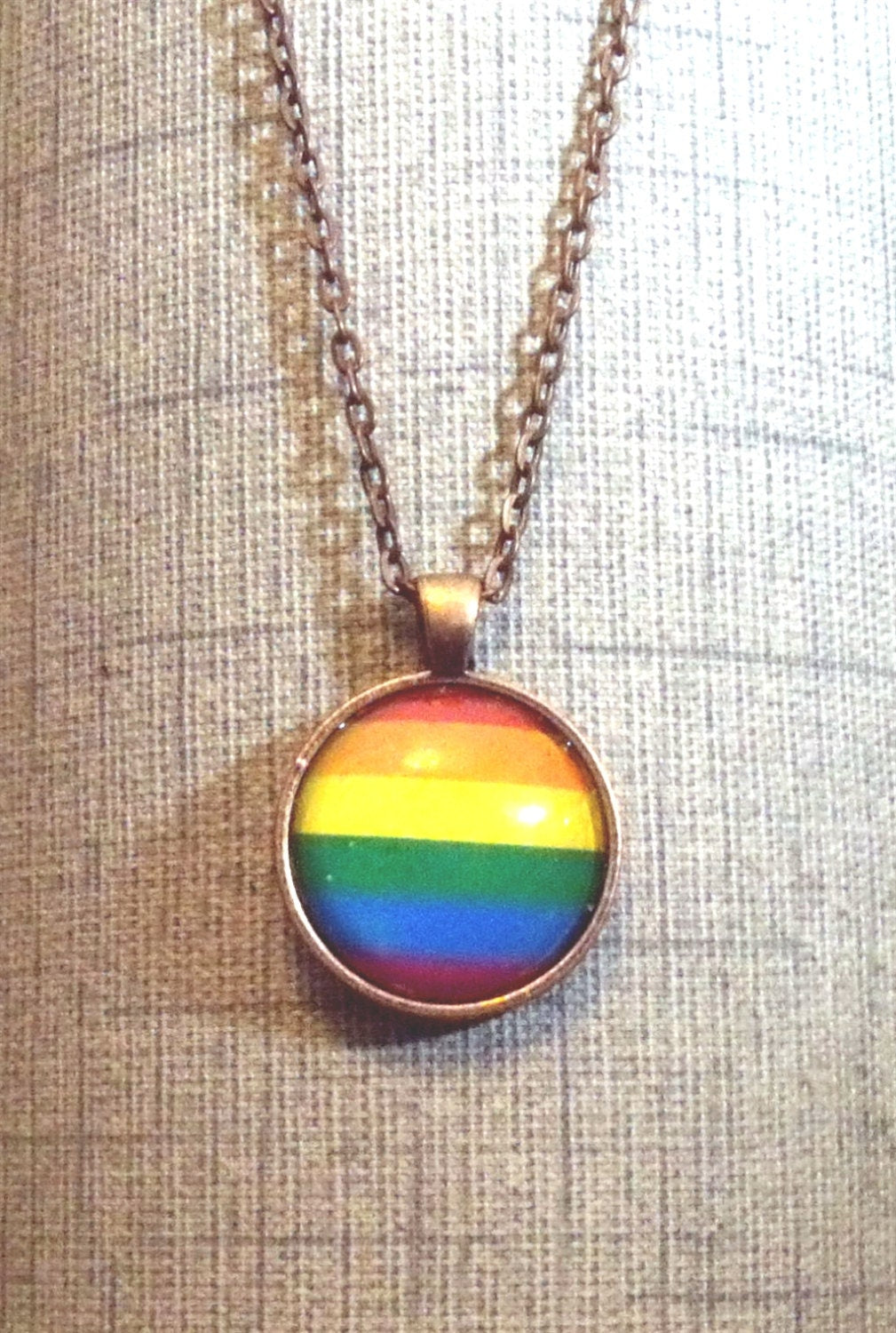 Gay Pride Flag on a 1" round pendant necklace. Antique brass tone setting and chain.