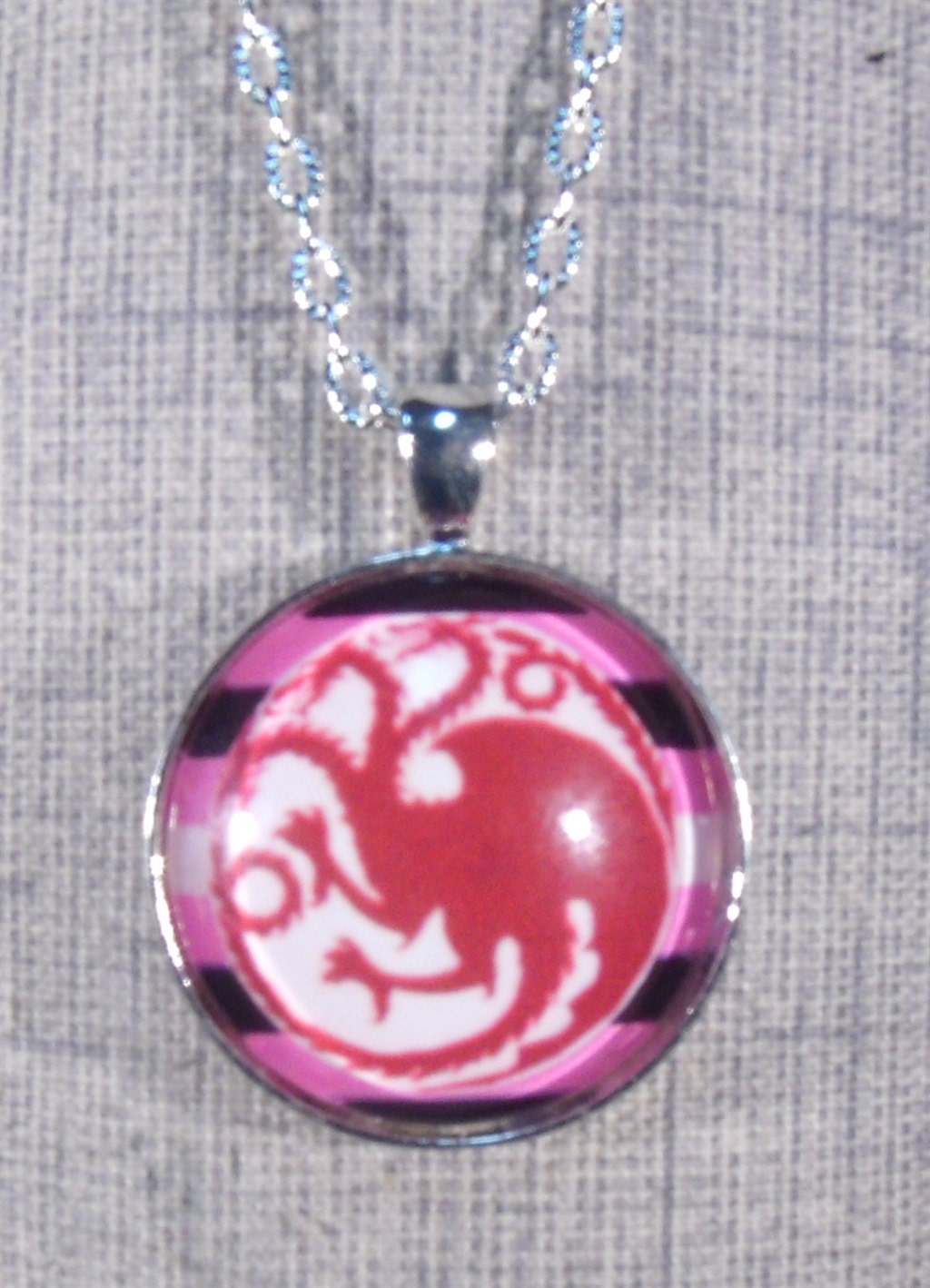 GOT Danerys Targaryan Dragon design with a leather girl pride background, on a 30mm round pendant necklace. Silver tone setting and chain.
