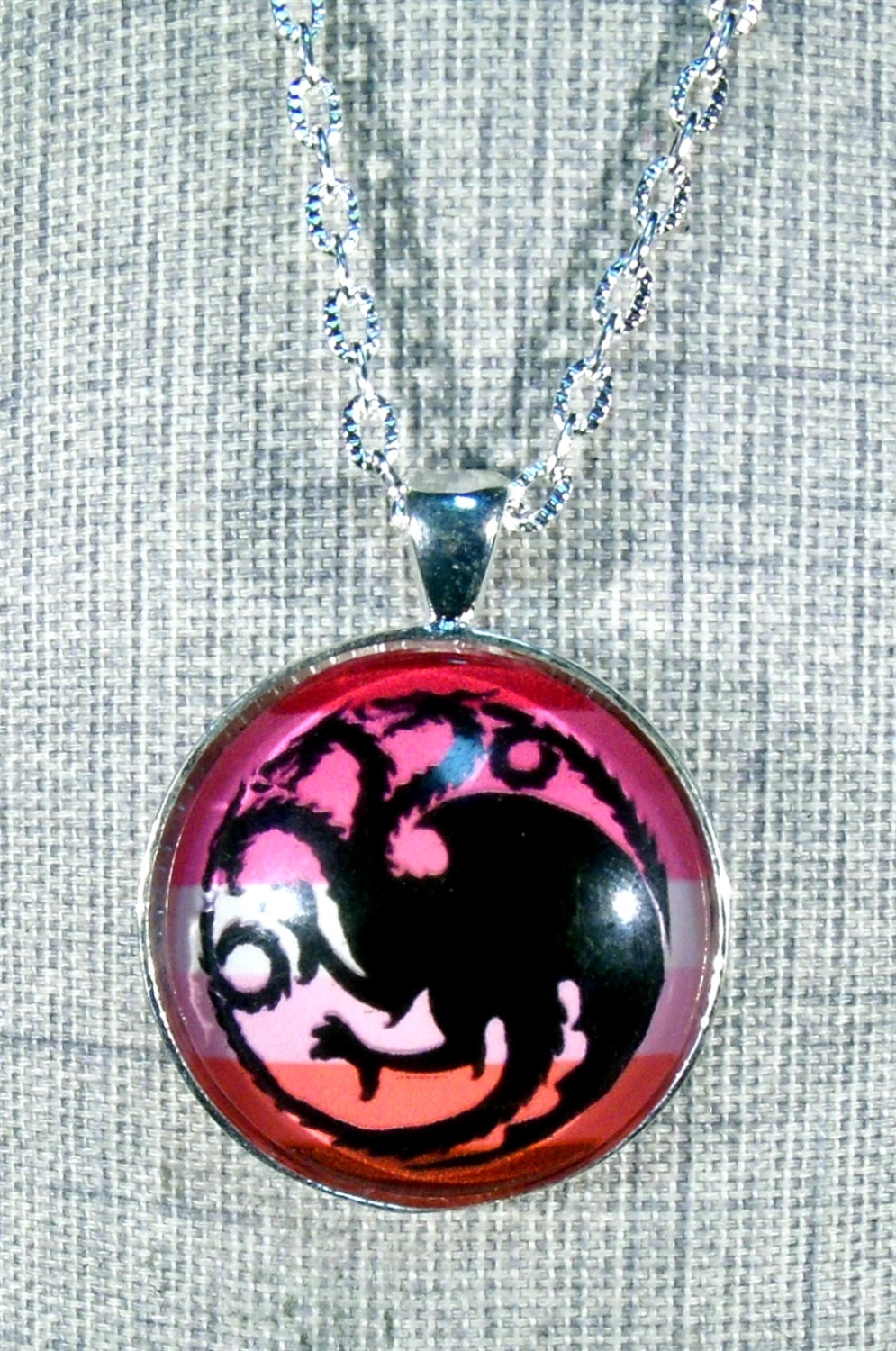 GOT Danerys Targaryan Dragon design with a lesbian pride background, on a 30mm round pendant necklace. Silver tone setting and chain.