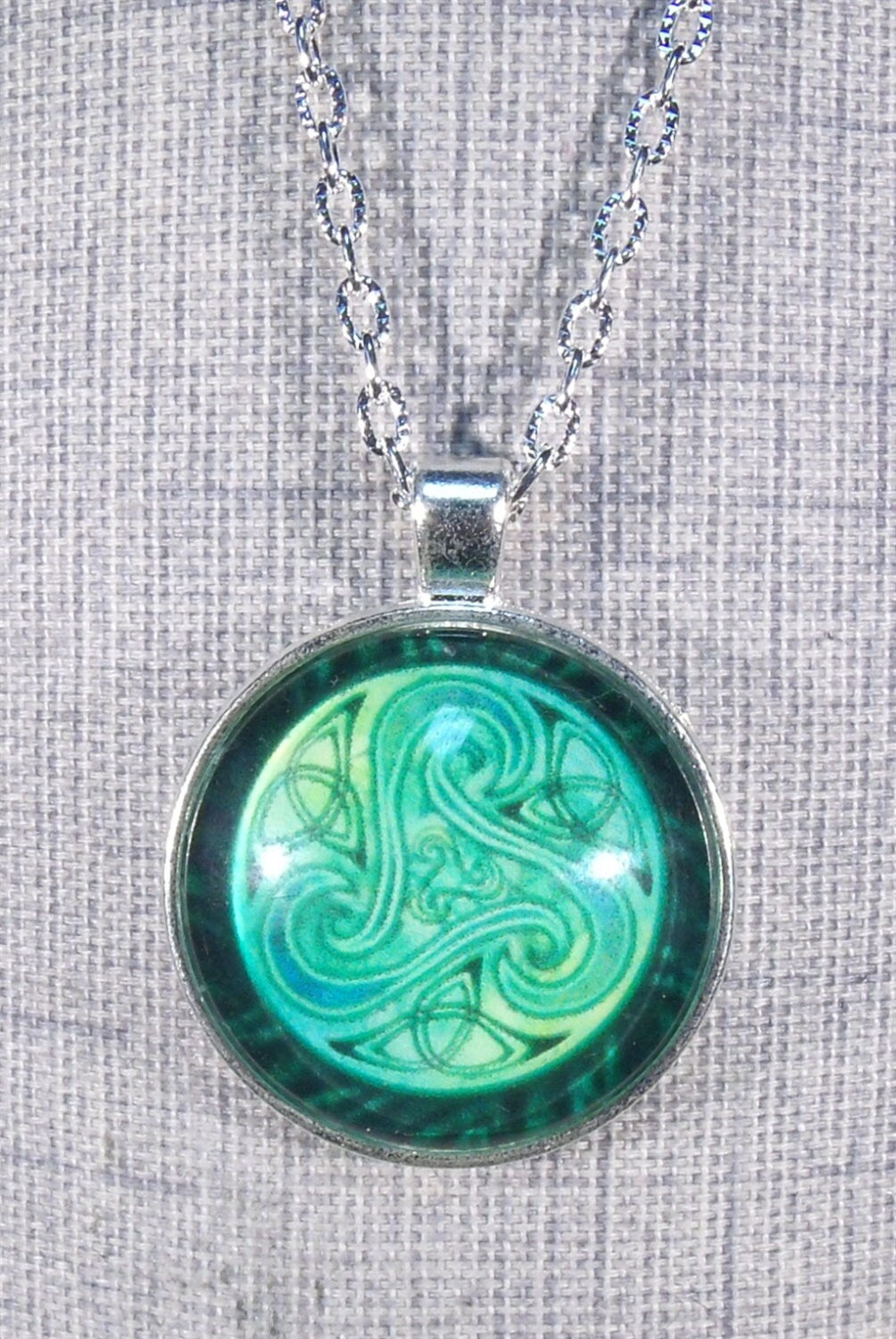 Green triskelion design on a 30mm round pendant necklace. Silver tone setting and chain.