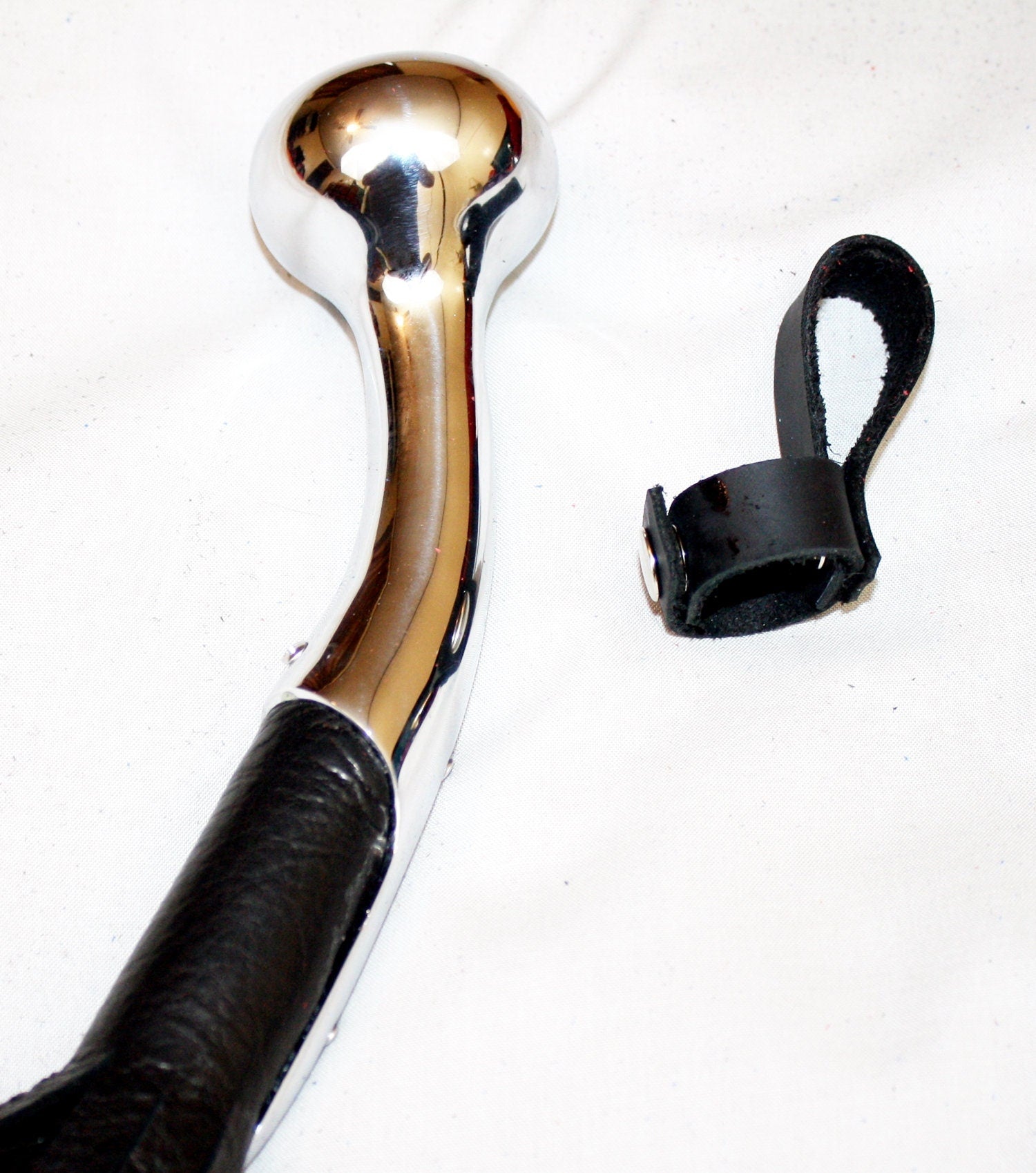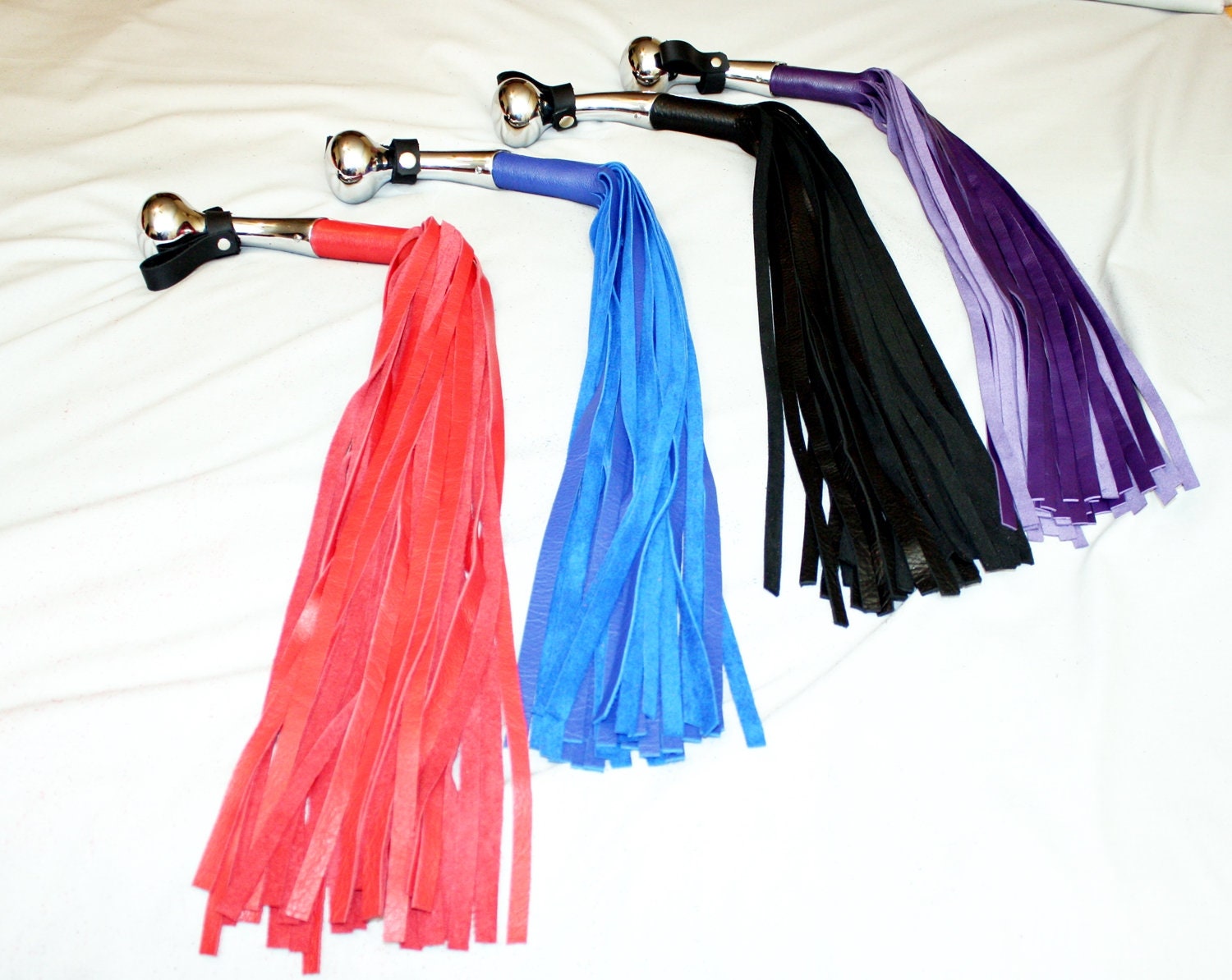 Bright chrome hame handle full sized medium leather flogger crafted from soft, tumbled cowhide.