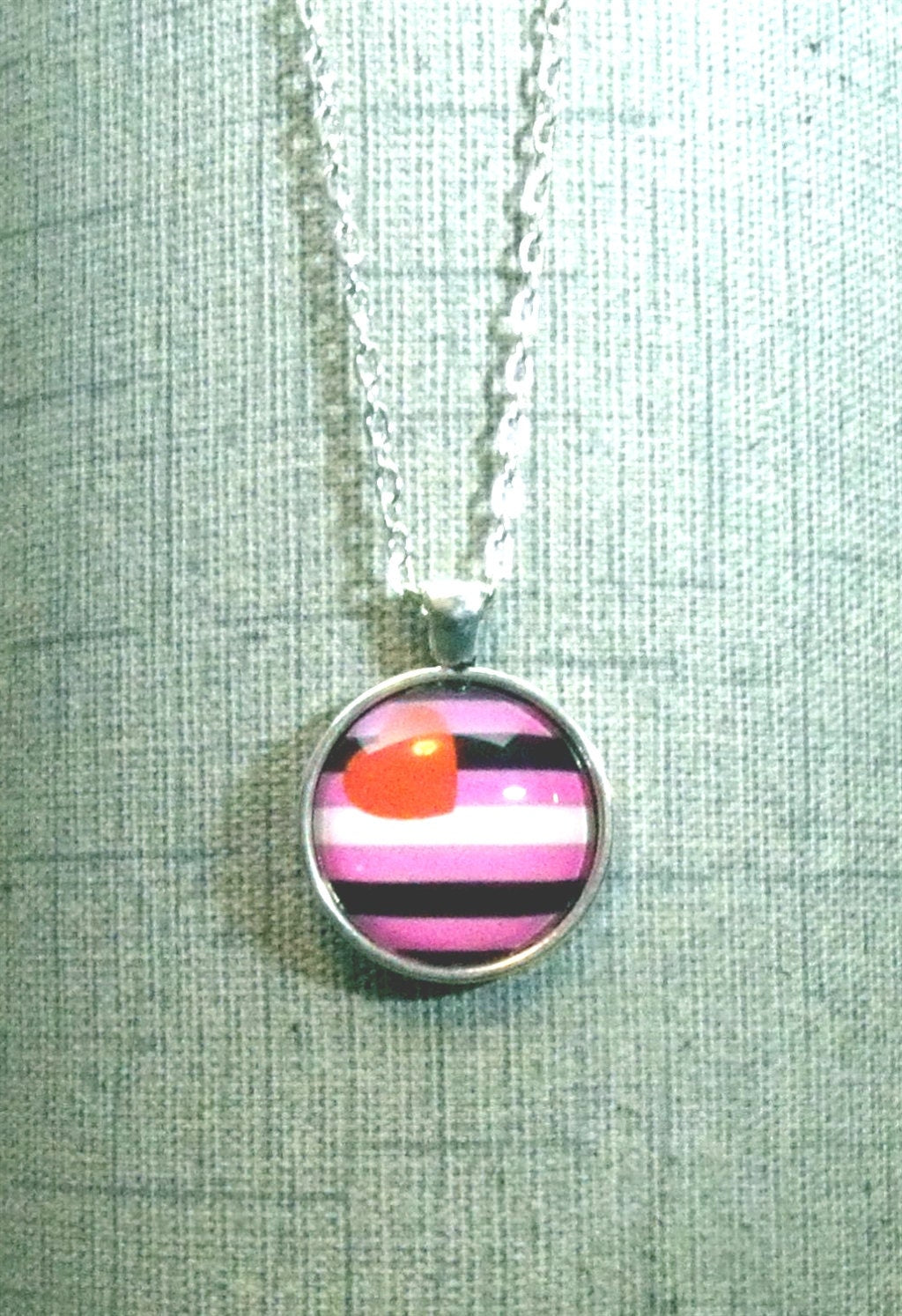 Leather Girl Pride Flag on a 1" round pendant necklace. Silver tone setting and chain.