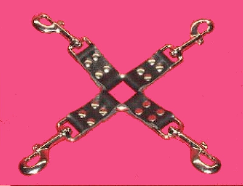 Four-way leather snaps for a quick hog-tie. 11" across with rotating snap hooks.