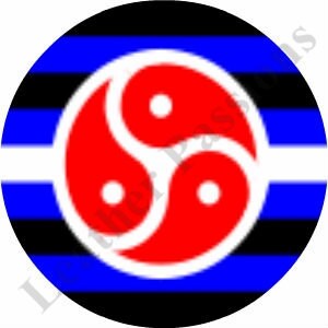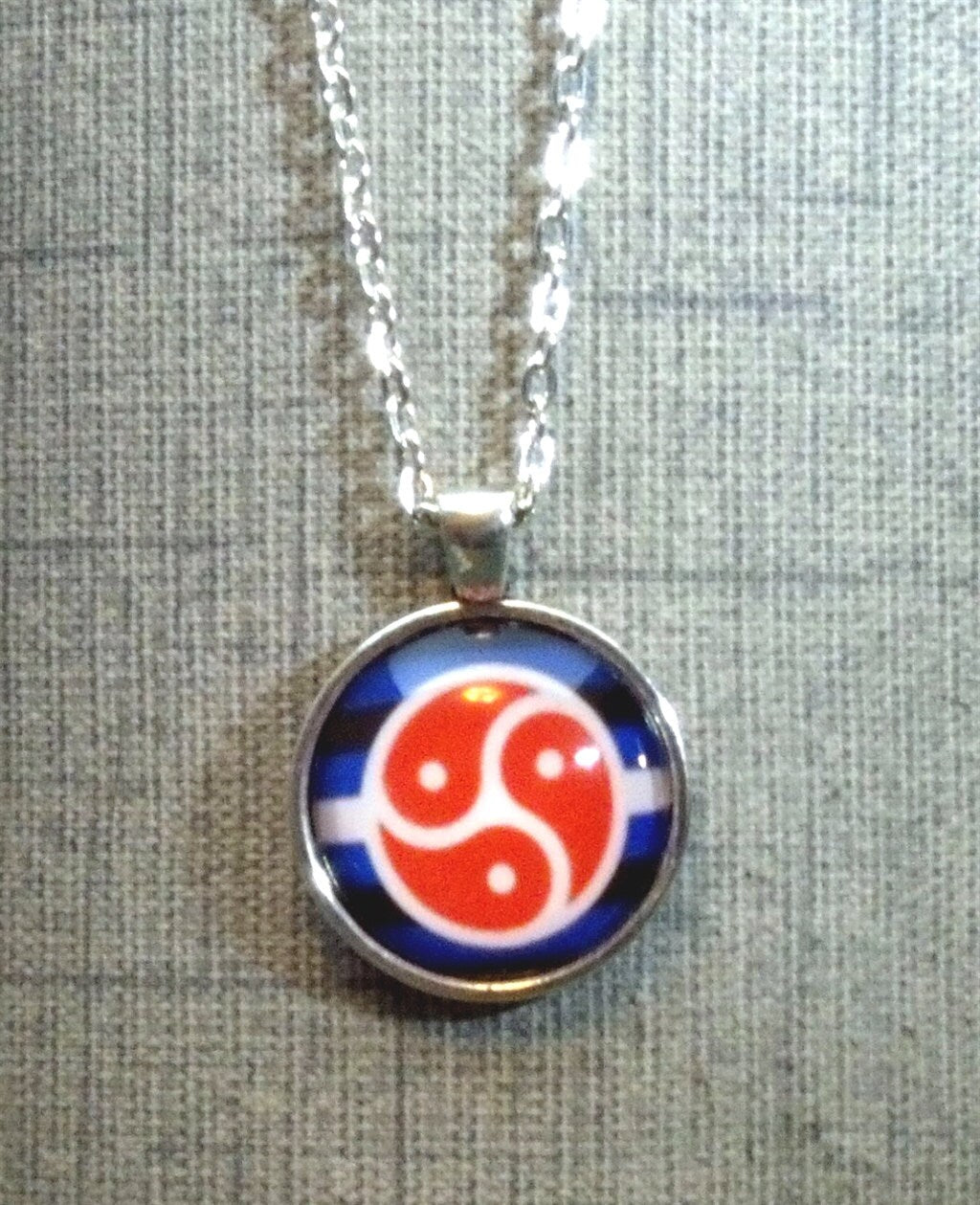 Leather Pride with red triskelion flag on a 1" round pendant necklace. Silver tone setting and chain.