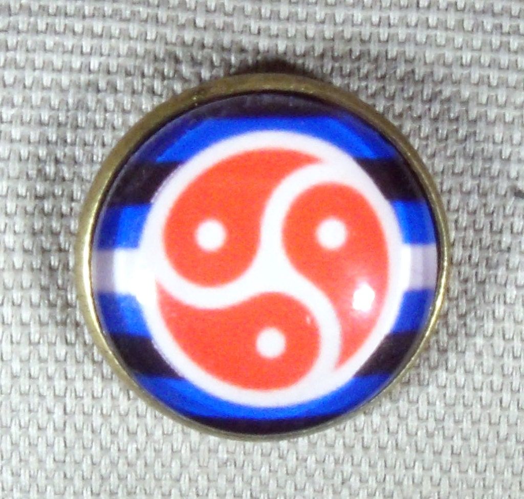 Leather Pride flag pin with triskelion. 20mm diameter glass dome, pin back.