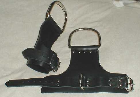 Heavy leather cuffs designed to prevent pressure over delicate nerves and blood vessels at the wrist. Nickel plated hardware with D Ring at the wrist for versatility. Soft fleece lined for comfort.
