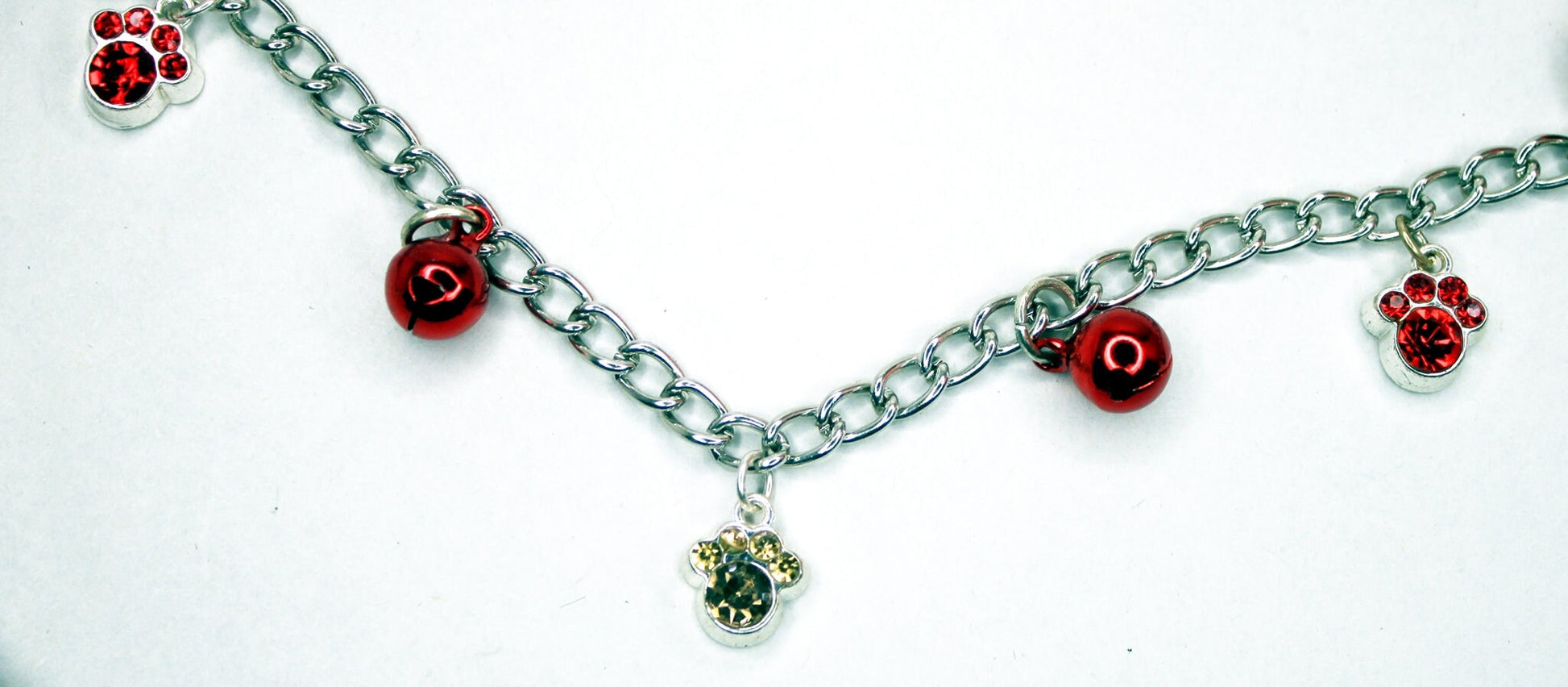 12" chain with 4 red bells, 2 red and 1 gold crystal puppy paw charms.