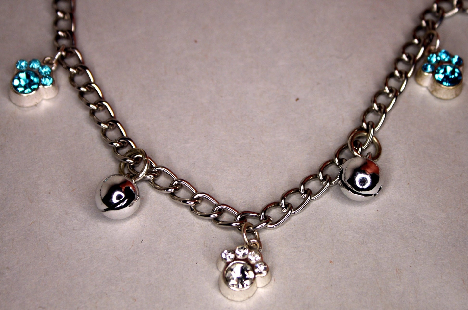 12" chain with 4 silver bells, 2 blue and 1 clear crystal puppy paw charms.