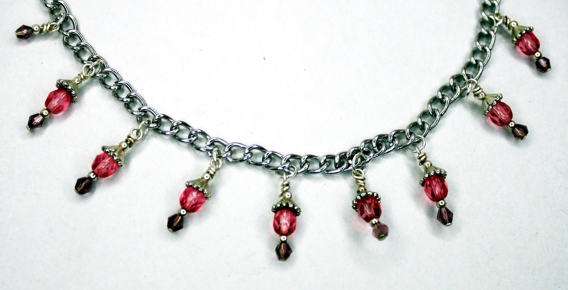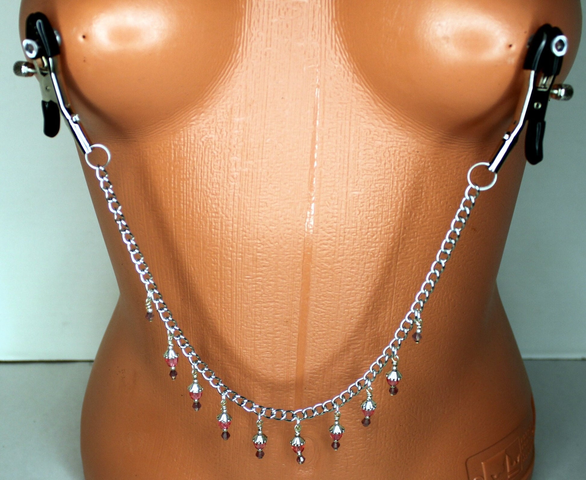 Adjustable nipple clamps with single silver chain, with red bead dangles.
