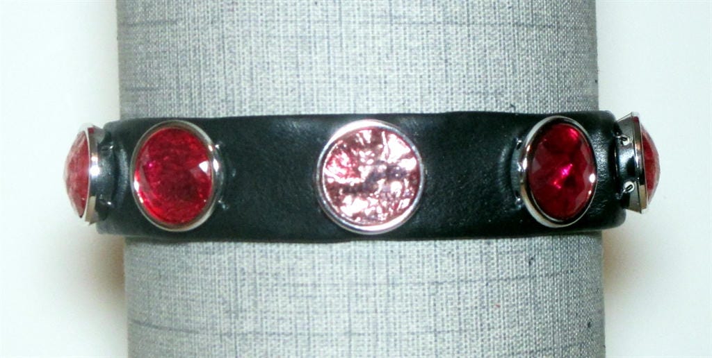 Large pink & red jewels on black naked leather.