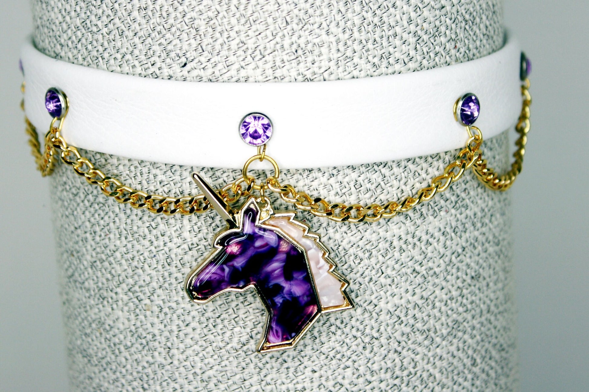 Elegant soft white premium leather dress collar with beautiful purple enameled unicorn on a gold tone chain, purple crystal rivets. A beautiful choker to the vanilla world.