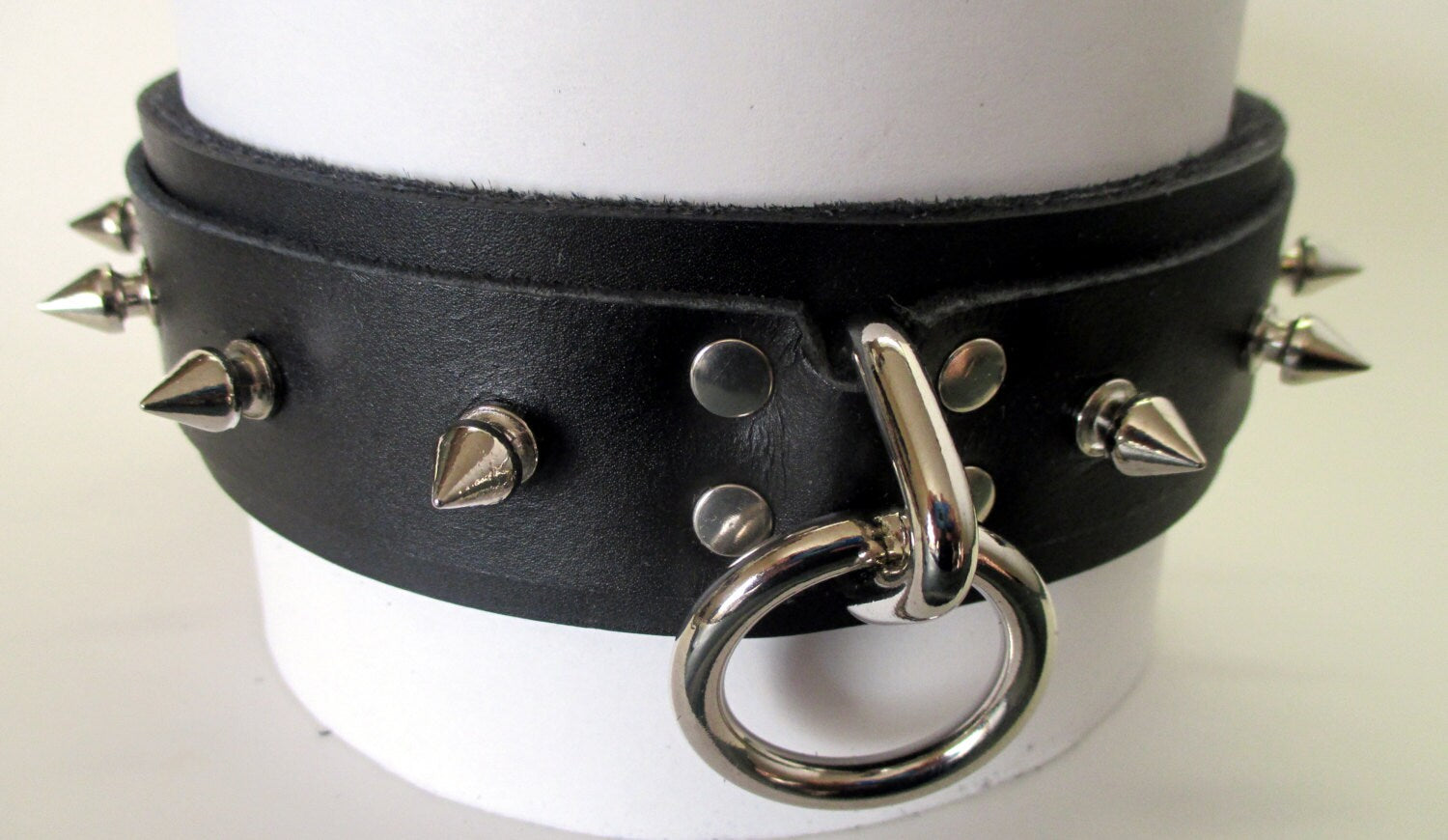 Leather collar with nickel plated spikes, drop ring, locking buckle.