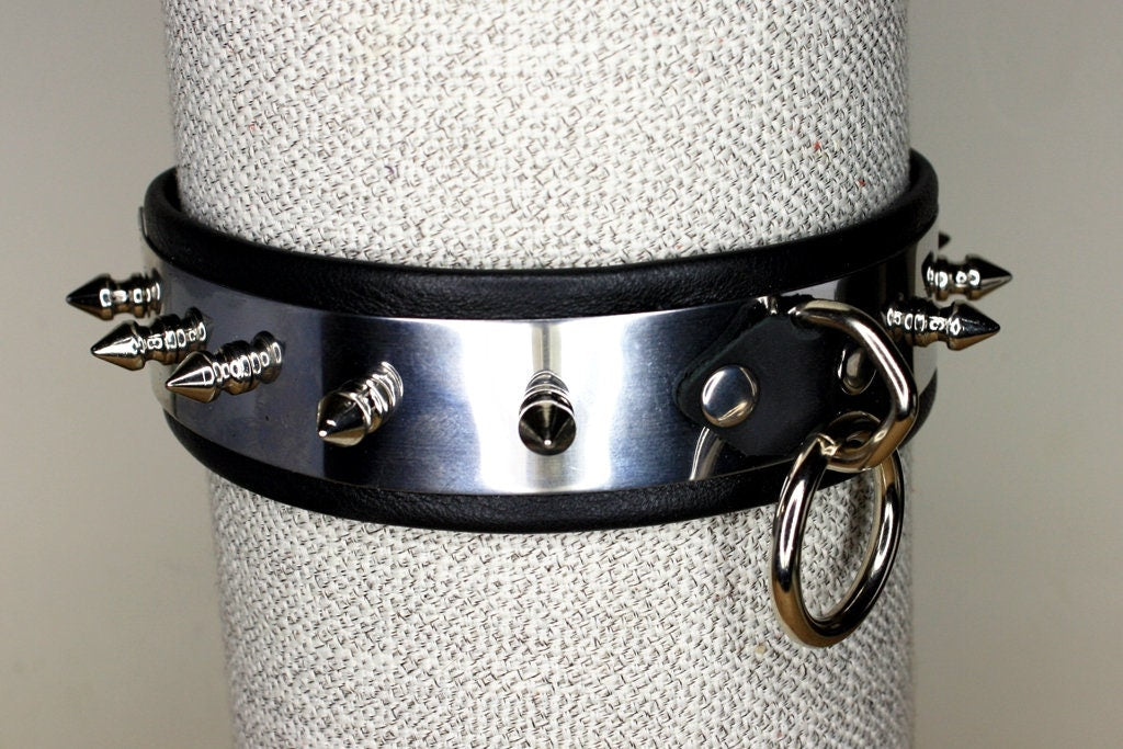 Stainless steel collar with spikes, leather backing, locking hasp closure.
