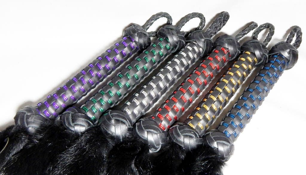 Our bunny furs are imported from Spain, where they are raised for food, not the fur. We select only the biggest, fullest pelts, and mount them on a braided leather handle. Your choice of handle braid color: Red, Blue, Purple, Green Silver, Gold